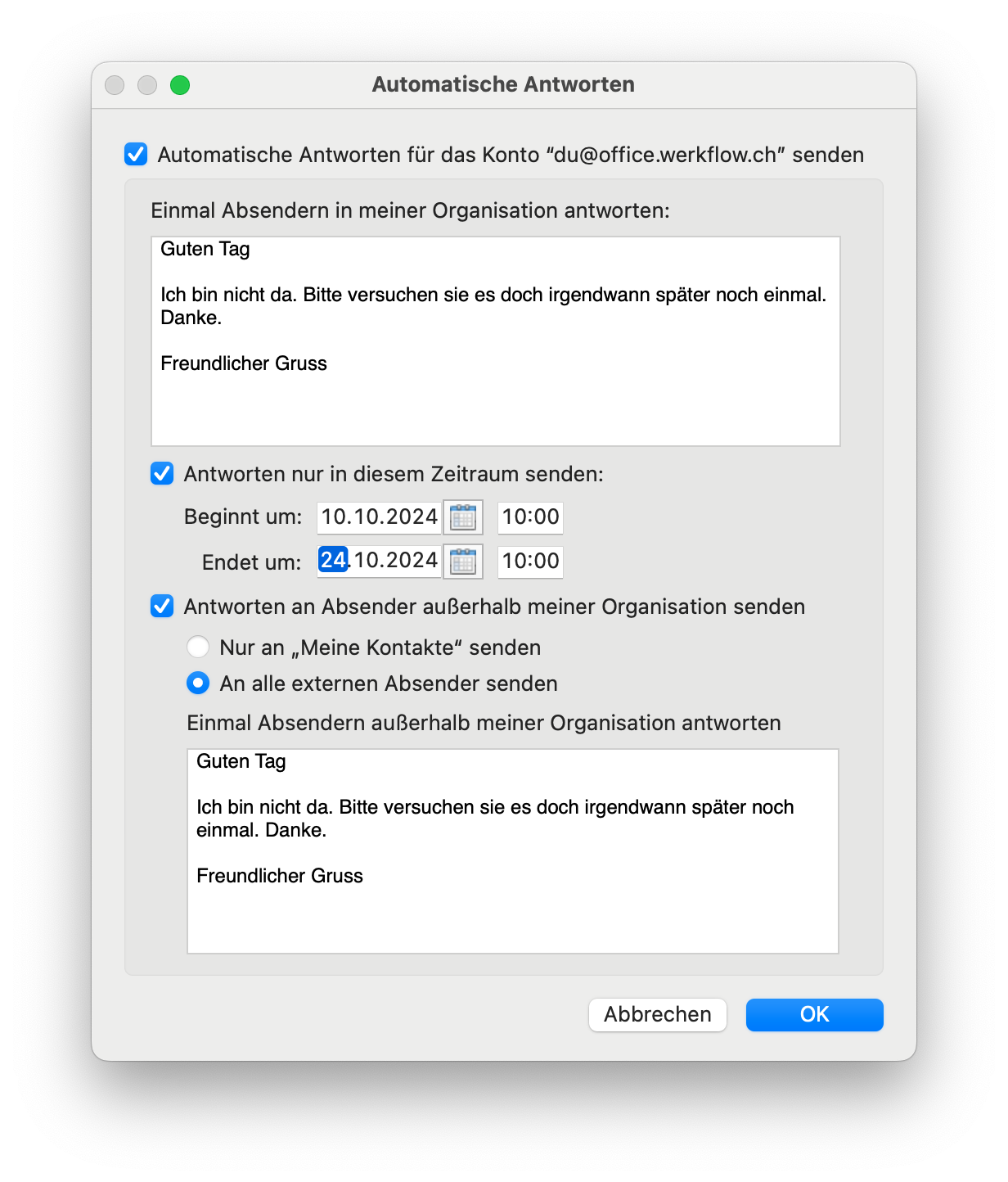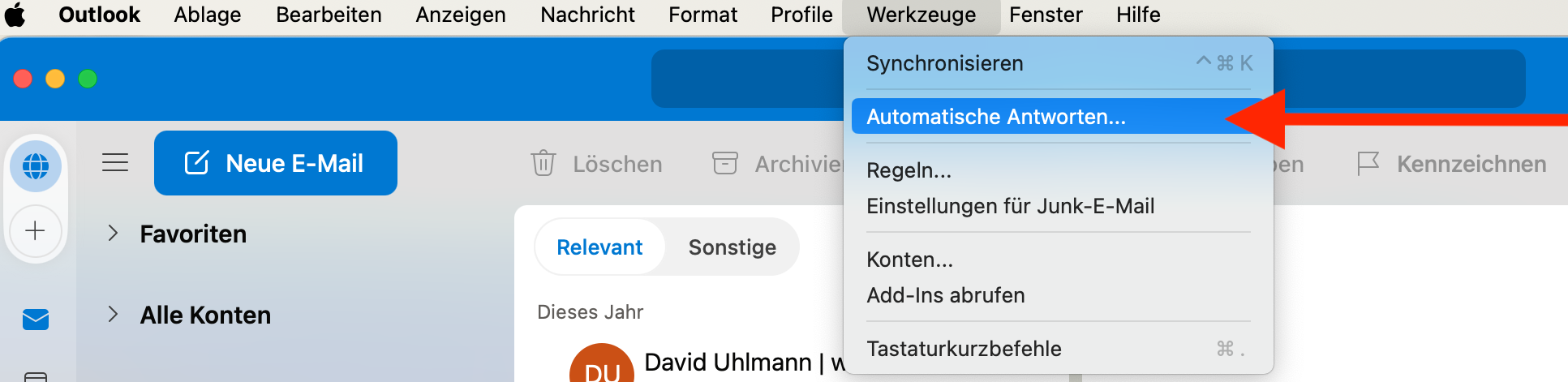 Outlook > Menü Werkzeuge > Automatische Antworten