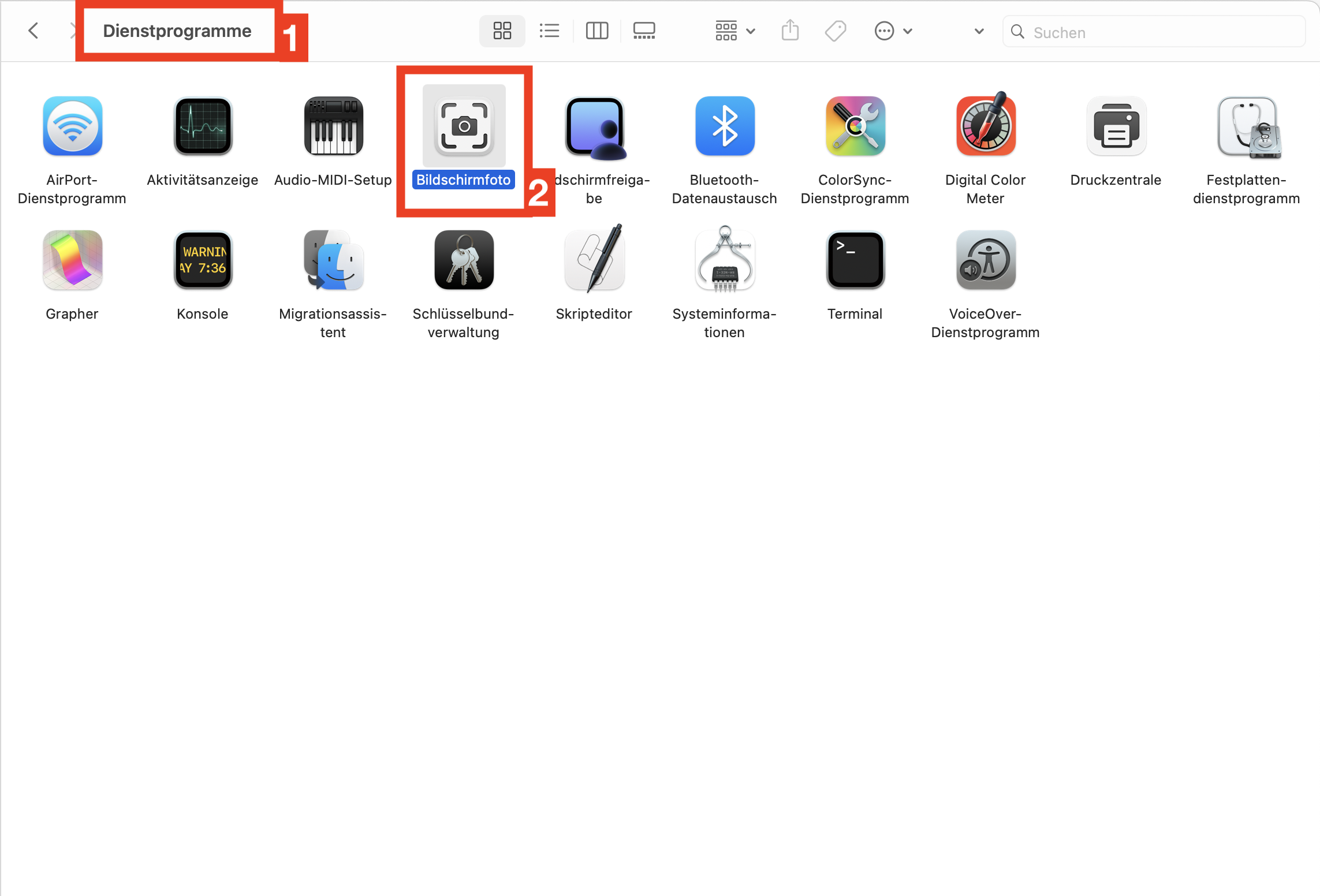 Gehe in die Dienstprogramme 1 (Programme > Dienstprogramme) und starte das Programm Bildschirmfoto 2