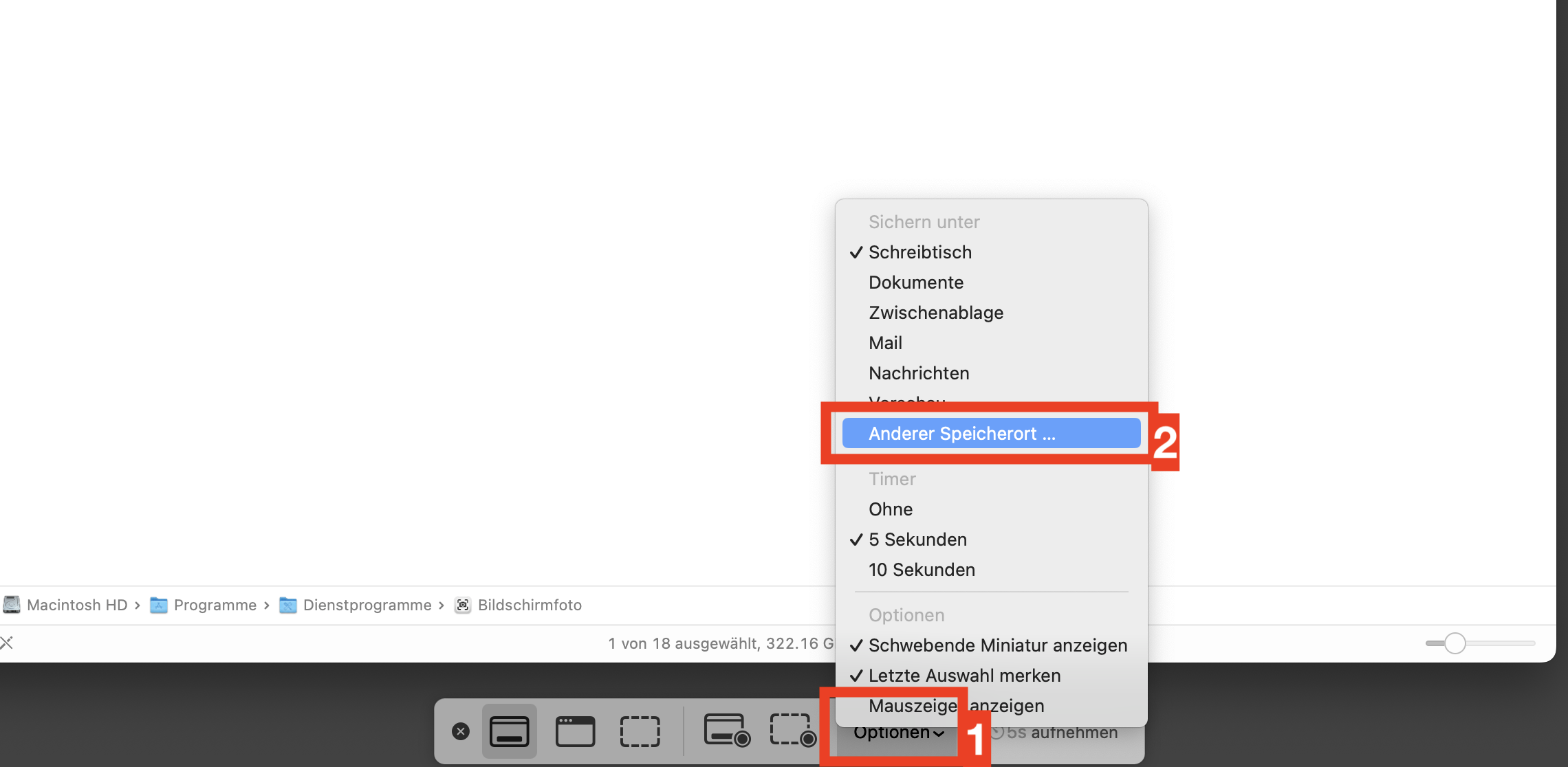 Wähle Optionen 1 und Anderer Speicherort 2