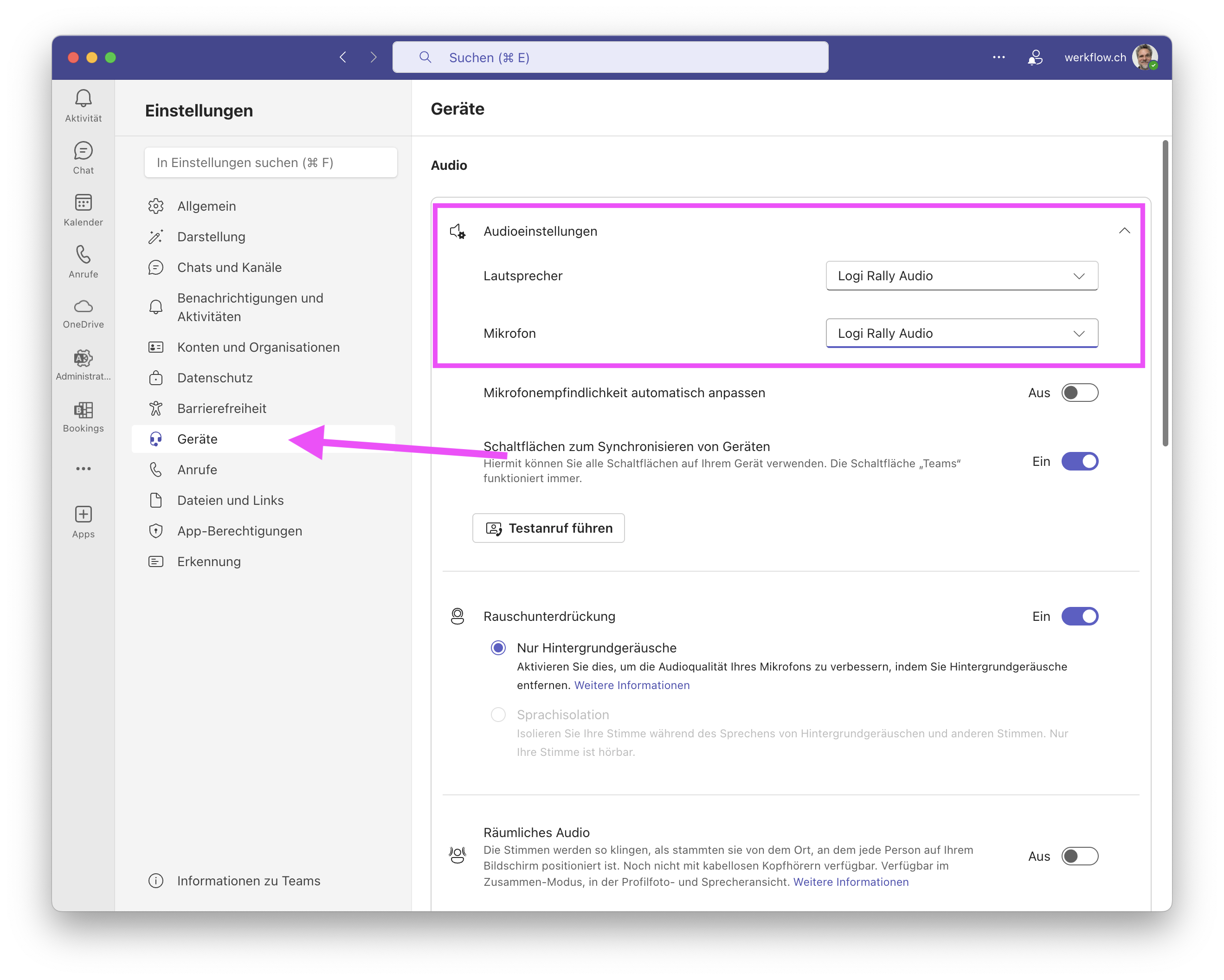 In Teams wählst du Logi Rally Audio für Lautsprecher und Mikrofon aus