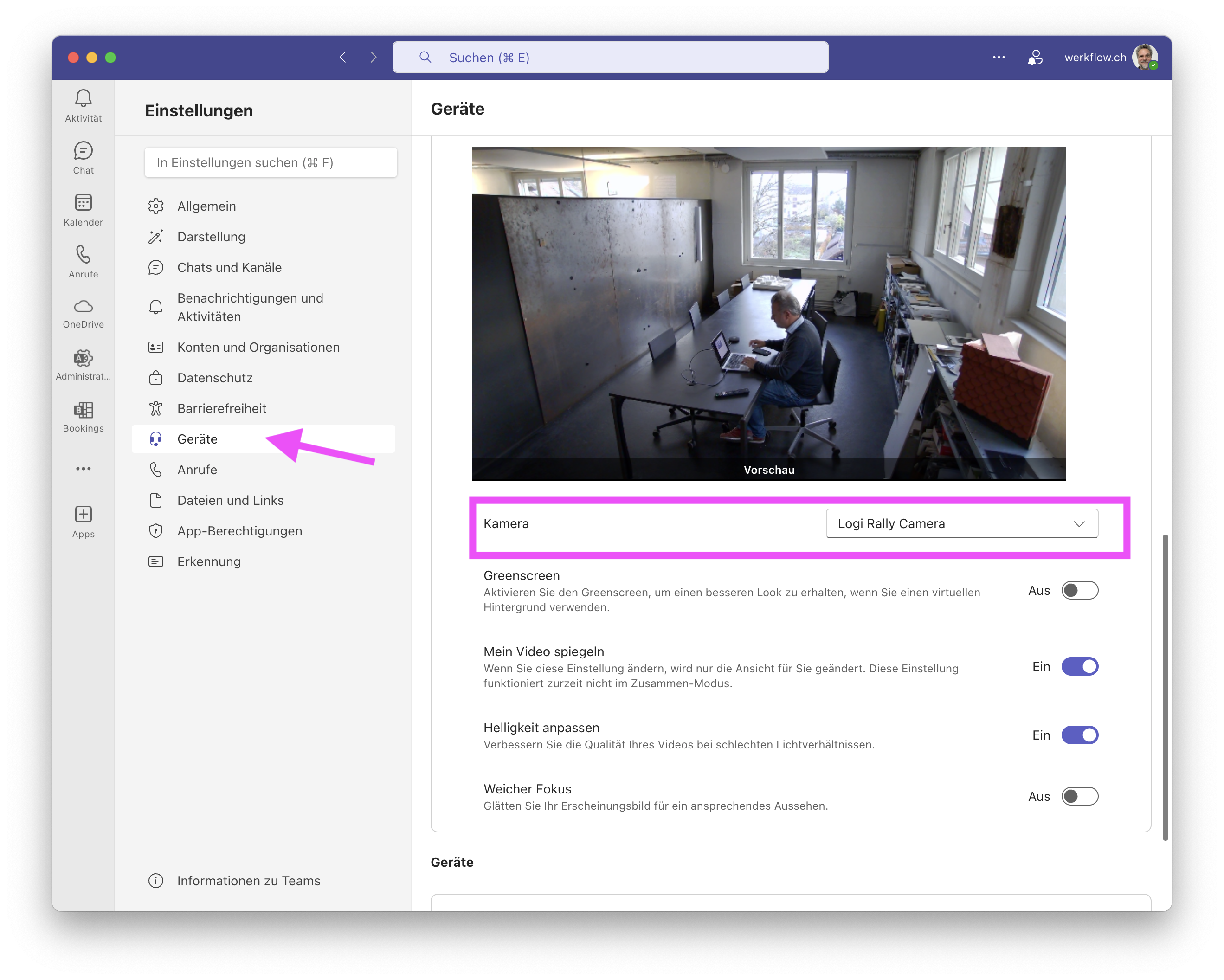 | Wähle als Kamera die Logitech Rally Camera aus |